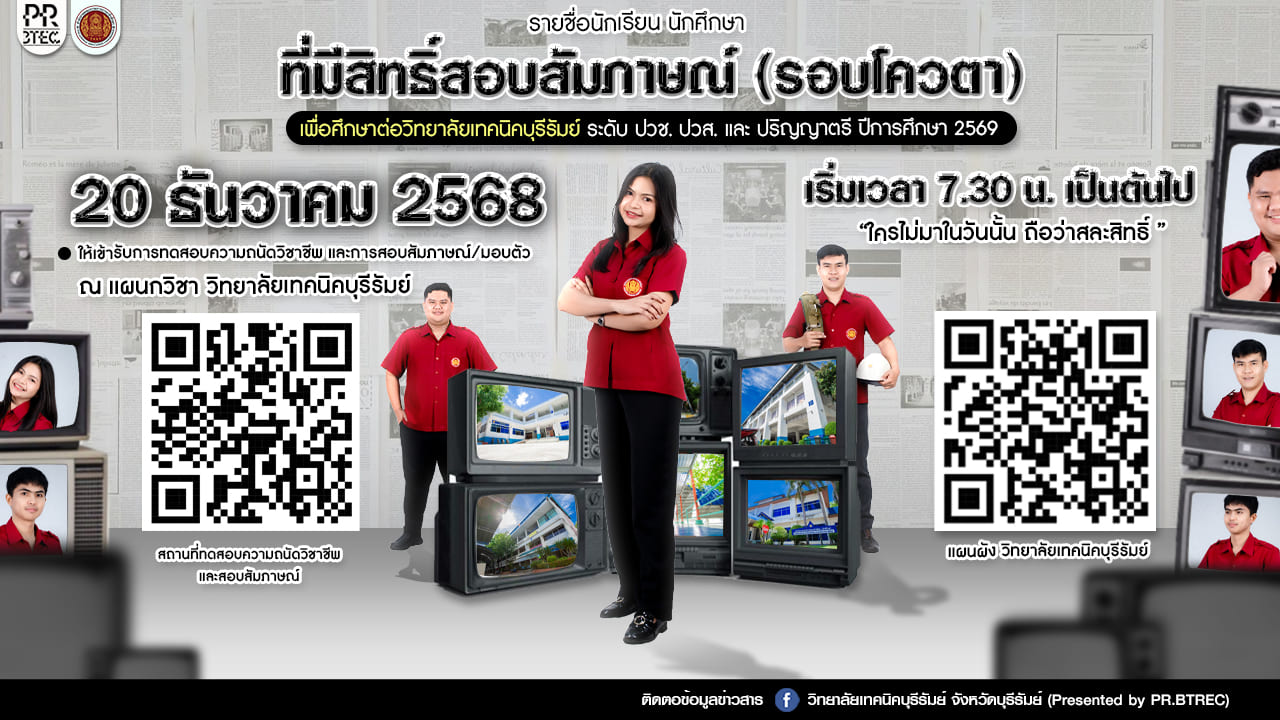 ประกาศรายชื่อนักเรียน นักศึกษา ที่มีสิทธิ์สอบสัมภาษณ์ฯ (โควตา) ระดับ ปวช. ปวส. และ ปริญญาตรี ประจำปีการศึกษา 2569...